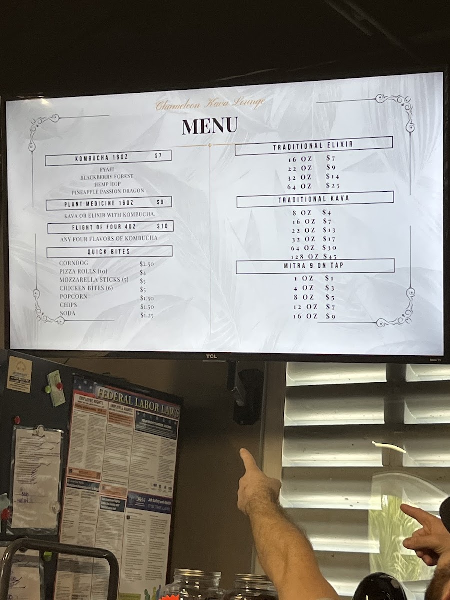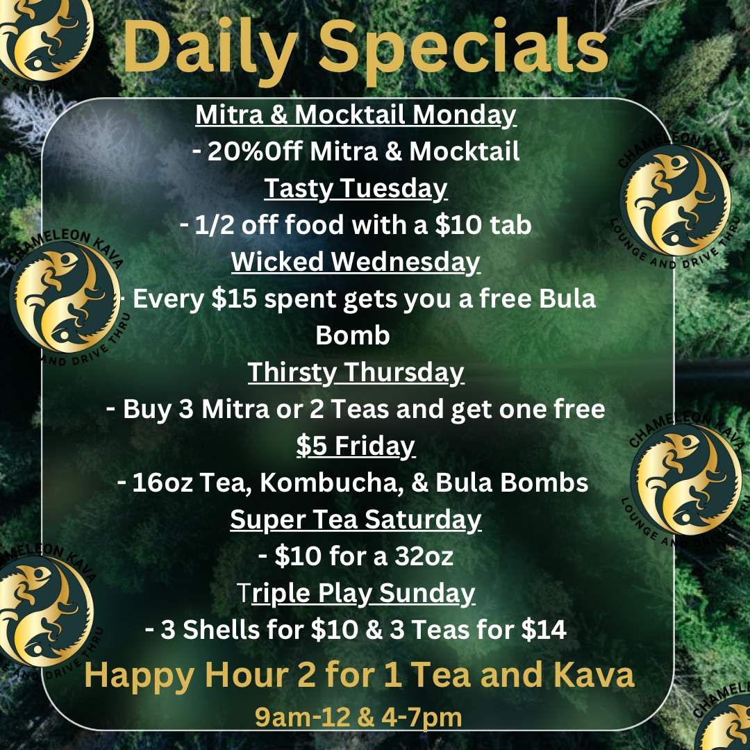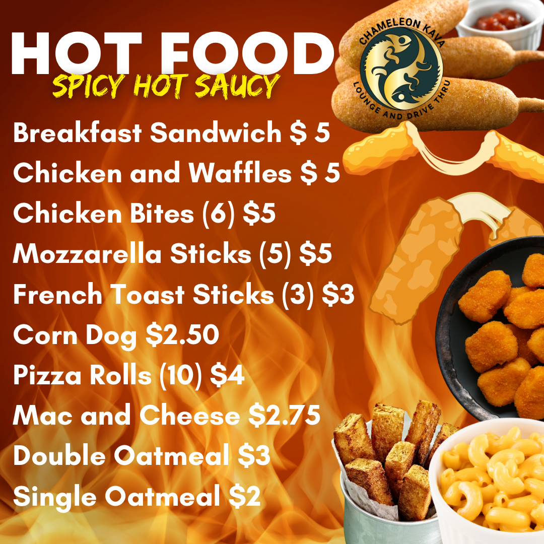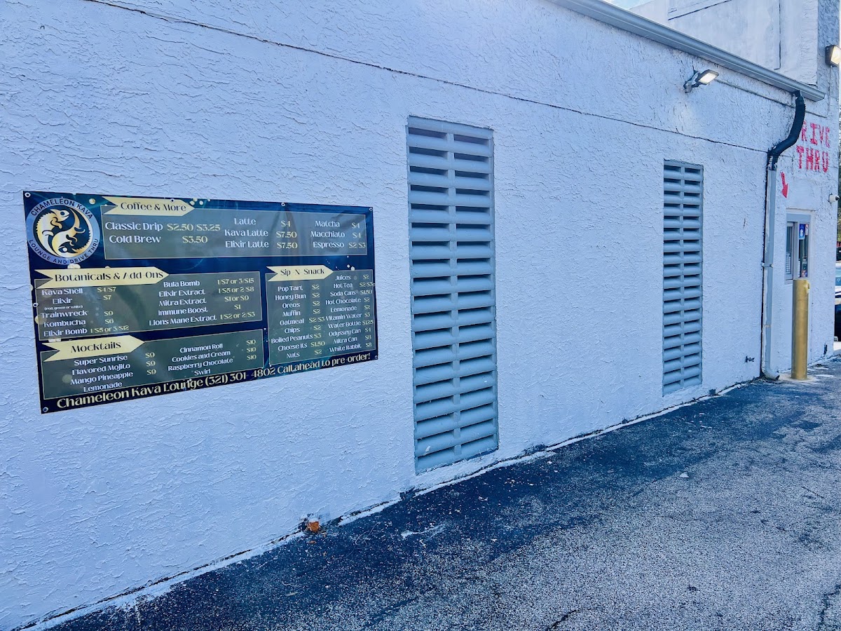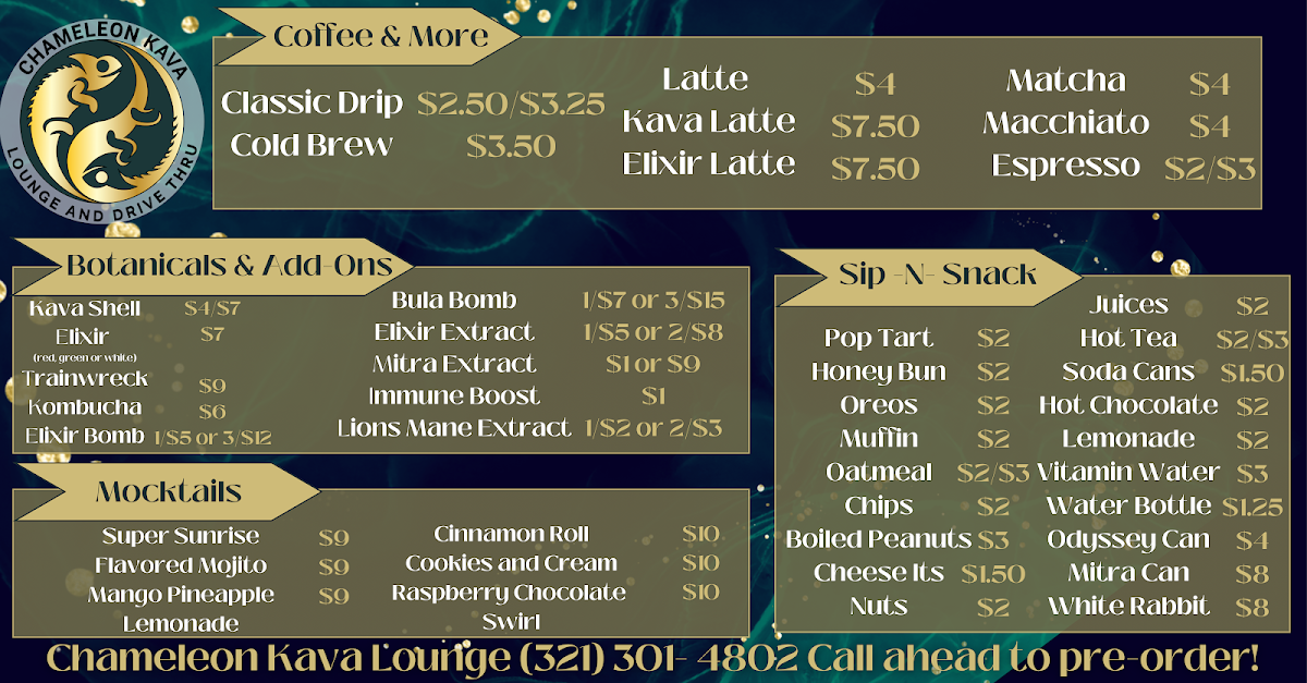 At Chameleon Kava Lounge, the menu offers a variety of unique drinks and snacks perfect for any occasion. For those looking for refreshing and non-alcoholic options, the mocktails stand out, including the Cocoa-Nut Kava, Cinnamon Roll Kava, and Cookies and Cream Kava-all offering a delightful twist on traditional kava flavors. For something fruity, the Super Sunrise and Mango Pineapple Lemonade are excellent choices. The coffee selection includes classic favorites like Cold Brew, Classic Drip, and Latte, with a more specialized offering of the MatchaElixir Latte. Additionally, the menu features several botanicals and add-ons, such as Mitra Extract 16oz, Double Shell, and Orlando City KombuchaElixir Bomb, catering to those looking to enhance their beverage experience. For a light snack, customers can enjoy a selection of treats like Gushers, Lil Bites, Muffin, Hot Tea, and Chips. Whether you’re in the mood for a flavorful mocktail or a comforting coffee, Chameleon Kava Lounge has something for everyone.